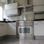 Oud herenhuis, moderne inrichting, houten vloeren, zithoek woonkamer hoge ramen met shutters, verhoogde keuken met granieten vloer en aanrecht, achterkant openslaande deuren naar bestrate tuin met 2 zitgedeeltes, gebruik van sanitair/tuin.